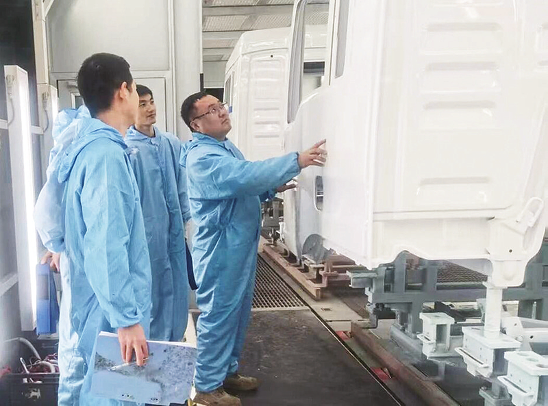 李一虎(右一)带领团队在车身厂涂卸车间检查外观漆面